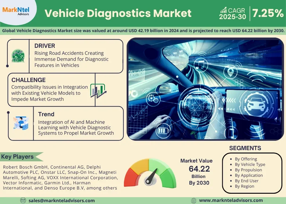 The Global Vehicle Diagnostics Market size was valued at around USD 42.19 billion in 2024 and is projected to reach USD 64.22 billion by 2030. Along with this, the market is estimated to grow at a CAGR of around 7.25% during the forecast period 2025-30. According to MarkNtel Advisors Study.