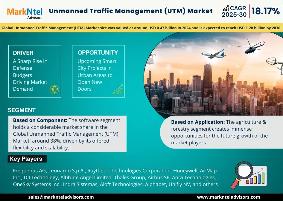 The Global Unmanned Traffic Management (UTM) Market size was valued at around USD 0.47 billion in 2024 and is expected to reach USD 1.28 billion by 2030. Along with this, the market is estimated to grow at a CAGR of around 18.17% during the forecast period, i.e., 2025-30. According to MarkNtel Advisors Study.