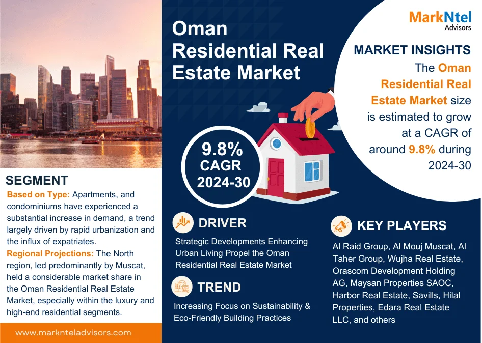 The Oman Residential Real Estate Market size is estimated to grow at a CAGR of around 9.8% during the forecast period, i.e., 2024-30. According to MarkNtel Advisors Study.