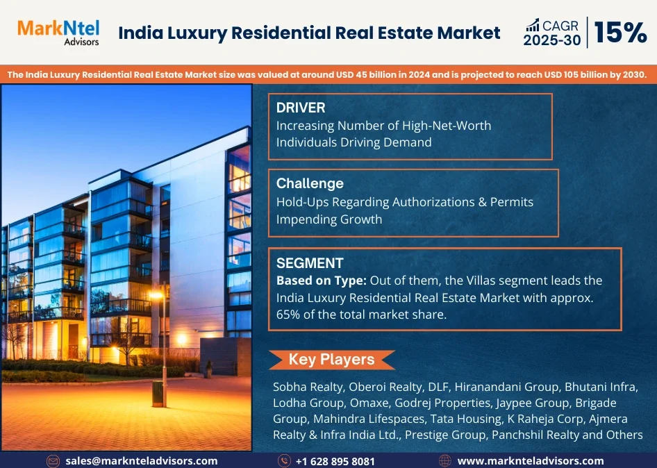 The India Luxury Residential Real Estate Market size was valued at around USD 45 billion in 2024 and is projected to reach USD 105 billion by 2030. Along with this, the market is estimated to grow at a CAGR of around 15% during the forecast period, i.e., 2025-30. According to MarkNtel Advisors Study.