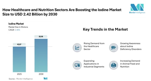 According to the Iodine Market report by Mordor Intelligence, the market size was valued at USD 1.82 billion in 2024 and is expected to reach USD 2.42 billion by 2030, growing at a CAGR of 4.84% during the forecast period (2024–2030). The increasing demand for iodine across pharmaceuticals, animal feed, nutrition, and industrial applications is driving this growth.
