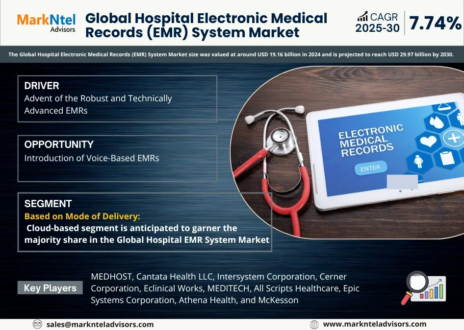 According to MarkNtel Advisors study The future of Global Hospital Electronic Medical Records (EMR) System Market size was valued at around USD 19.16 billion in 2024 and is projected to reach USD 29.97 billion by 2030. Along with this, the market is estimated to grow at a CAGR of around 7.74% during the forecast period, i.e., 2025-30.
