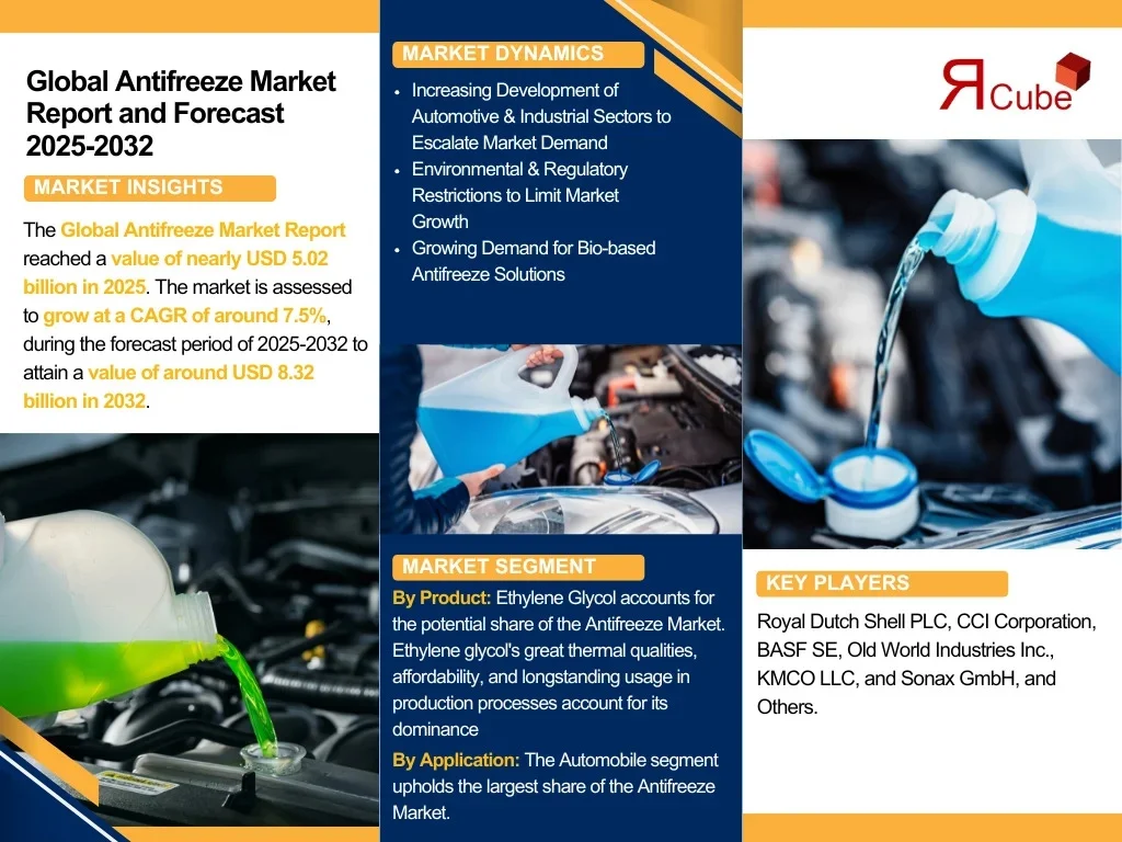 According to recent study by The Report Cube the Global Antifreeze Market reached a value of nearly USD 5.02 billion in 2025. The market is assessed to grow at a CAGR of around 7.5%, during the forecast period of 2025-2032 to attain a value of around USD 8.32 billion in 2032.