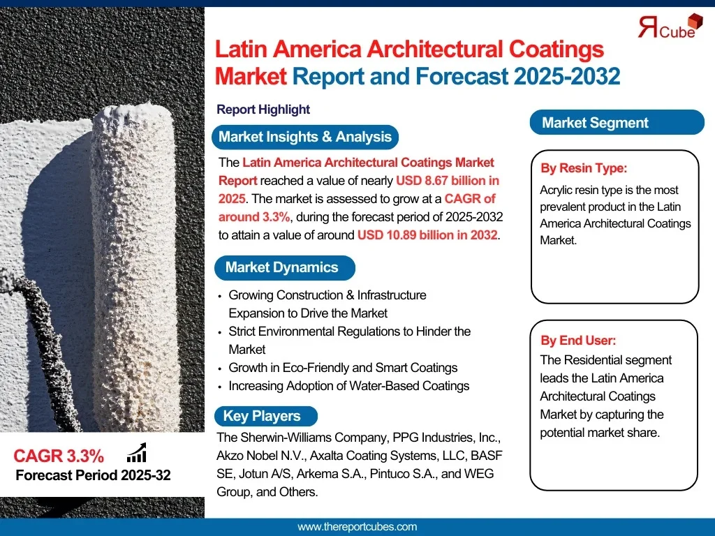 According to recent study by The Report Cube the Latin America Architectural Coatings Market reached a value of nearly USD 8.67 billion in 2025. The market is assessed to grow at a CAGR of around 3.3%, during the forecast period of 2025-2032 to attain a value of around USD 10.89 billion in 2032.