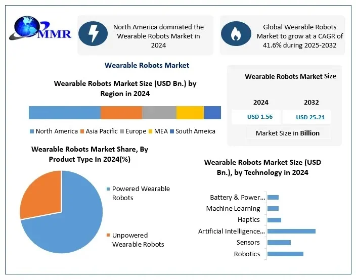 Wearable Robots Market was valued at USD 1.56 Bn. in 2024, and total global Wearable Robots Market revenue is expected to grow at a CAGR of 41.6% from 2025 to 2032, reaching nearly USD 25.21 Bn. Surging adoption in industrial & manufacturing sectors