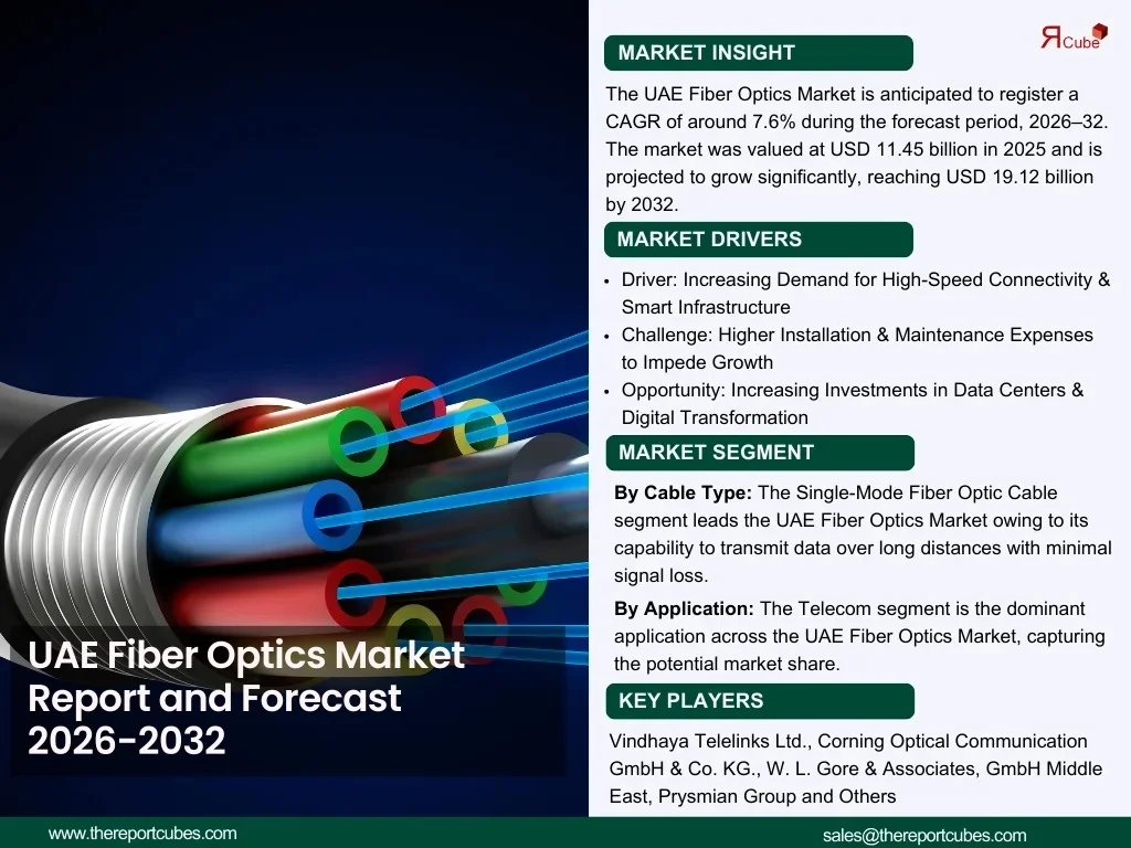 According to recent study by The Report Cube The UAE Fiber Optics Market is anticipated to register a CAGR of around 7.6% during the forecast period, 2026–32. The market was valued at USD 11.45 billion in 2025 and is projected to grow significantly, reaching USD 19.12 billion by 2032.