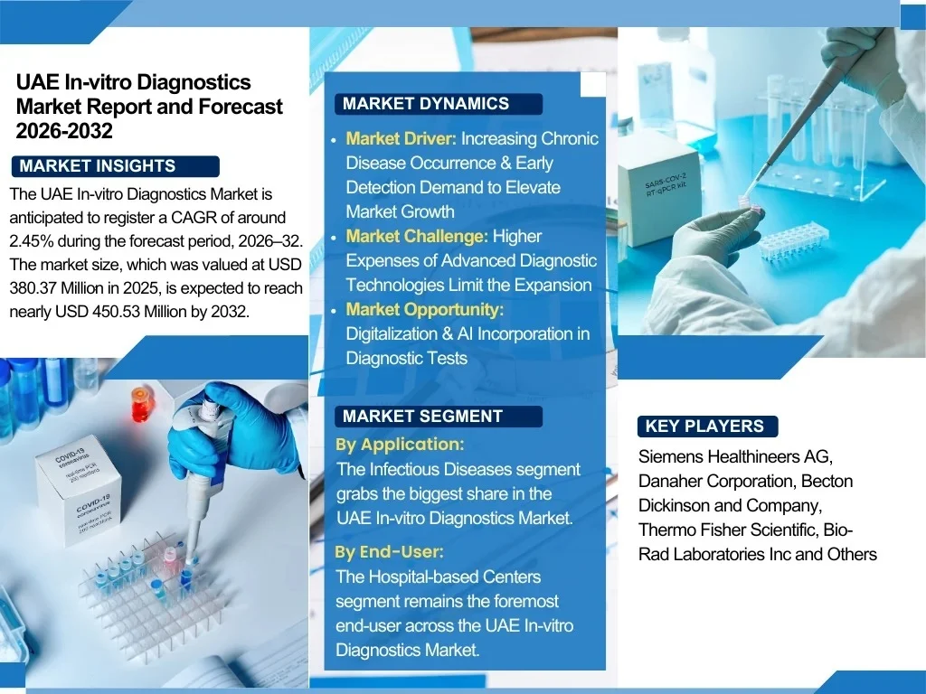 According to recent study by The Report Cube The UAE In-vitro Diagnostics Market is anticipated to register a CAGR of around 2.45% during the forecast period, 2026–32. The market size, which was valued at USD 380.37 Million in 2025, is expected to reach nearly USD 450.53 Million by 2032.