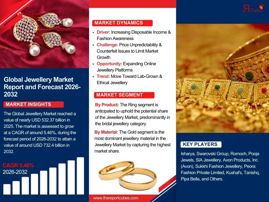 According to recent study by The Report Cube future of the Global Jewellery Market reached a value of nearly USD 532.37 billion in 2025. The market is assessed to grow at a CAGR of around 5.46%, during the forecast period of 2026-2032 to attain a value of around USD 732.4 billion in 2032.