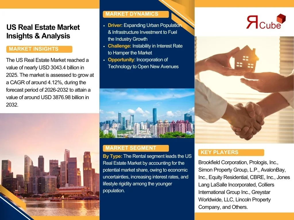 According to recent study by The Report Cube future of the US Real Estate Market reached a value of nearly USD 3043.4 billion in 2025. The market is assessed to grow at a CAGR of around 4.12%, during the forecast period of 2026-2032 to attain a value of around USD 3876.98 billion in 2032