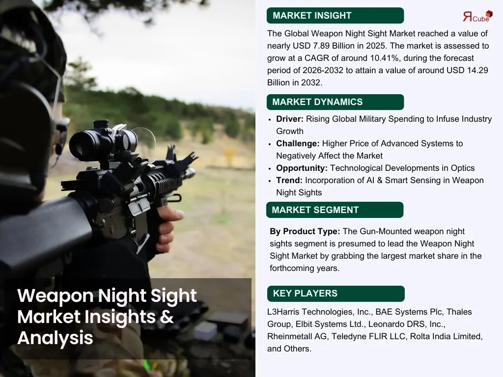 According to recent study by The Report Cube future of the Weapon Night Sight Weapon Night Sight Market reached a value of nearly USD 7.89 Billion in 2025. The market is assessed to grow at a CAGR of around 10.41%, during the forecast period of 2026-2032 to attain a value of around USD 14.29 Billion in 2032.