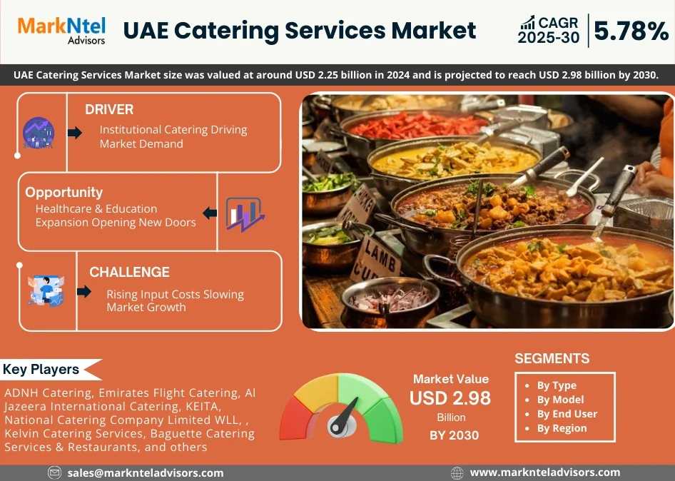 According to MarkNtel Advisors study The future of UAE Catering Services Market size was valued at around USD 2.25 billion in 2024 and is projected to reach USD 2.98 billion by 2030. Along with this, the market is estimated to grow at a CAGR of around 5.78% during the forecast period, i.e., 2025-30.