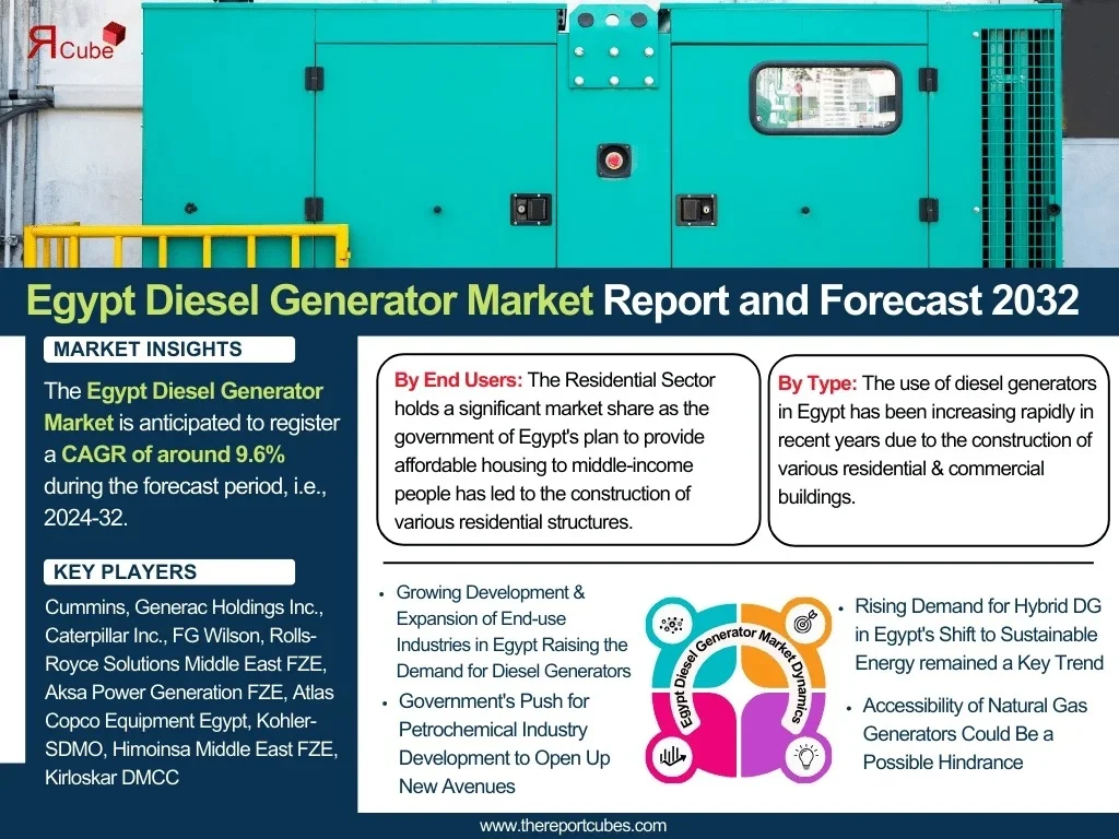 According to recent study by The Report Cube future of the Egypt Diesel Generator Market is anticipated to register a CAGR of around 9.6% during the forecast period, i.e., 2024-32. The industry's need for diesel generators has been driven by Egypt’s agricultural sector, which has been significantly dependent on these machines to pump water from wells for agricultural uses in remote places.
