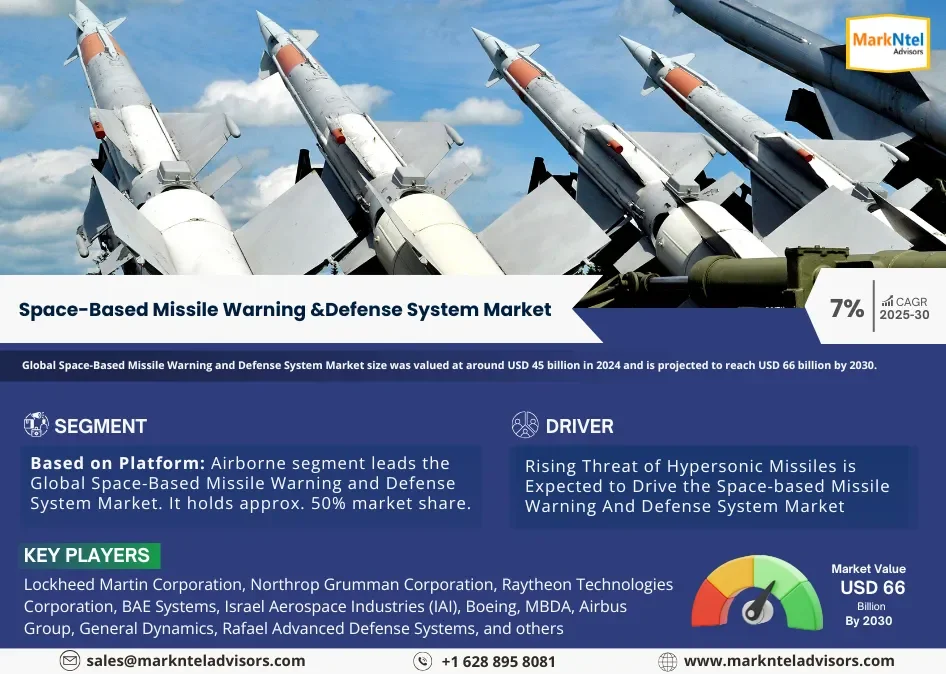 According to MarkNtel Advisors study The future of Global Space-Based Missile Warning and Defense System Market size was valued at around USD 45 billion in 2024 and is projected to reach USD 66 billion by 2030. Along with this, the market is estimated to grow at a CAGR of around 7% during the forecast period, i.e., 2025-30.