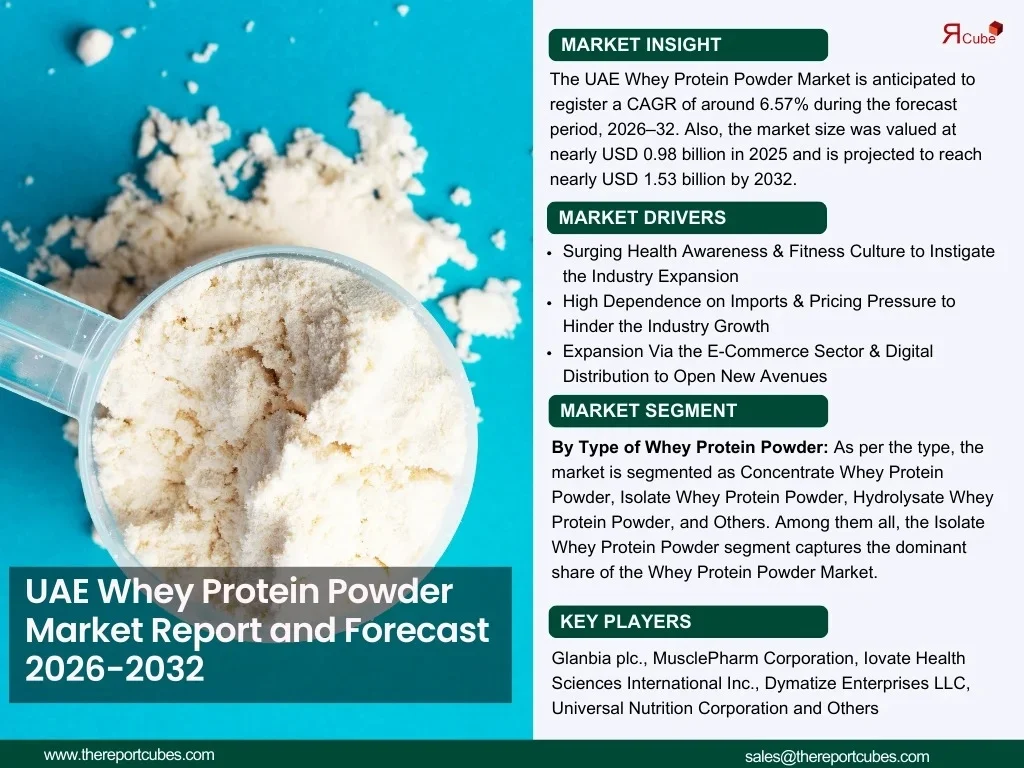 According to recent study by The Report Cube future of the UAE Whey Protein Powder Market is anticipated to register a CAGR of around 6.57% during the forecast period, 2026–32. Also, the market size was valued at nearly USD 0.98 billion in 2025 and is projected to reach nearly USD 1.53 billion by 2032.