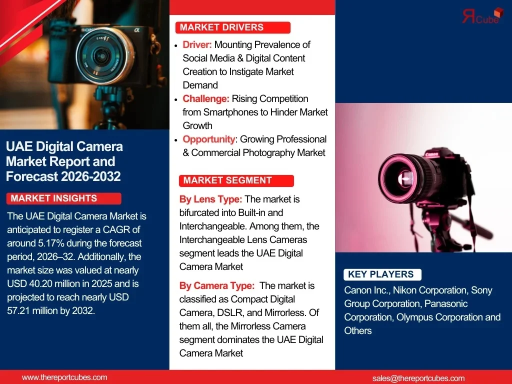 According to recent study by The Report Cube future of the UAE Digital Camera Market is anticipated to register a CAGR of around 5.17% during the forecast period, 2026–32. Additionally, the market size was valued at nearly USD 40.20 million in 2025 and is projected to reach nearly USD 57.21 million by 2032.
