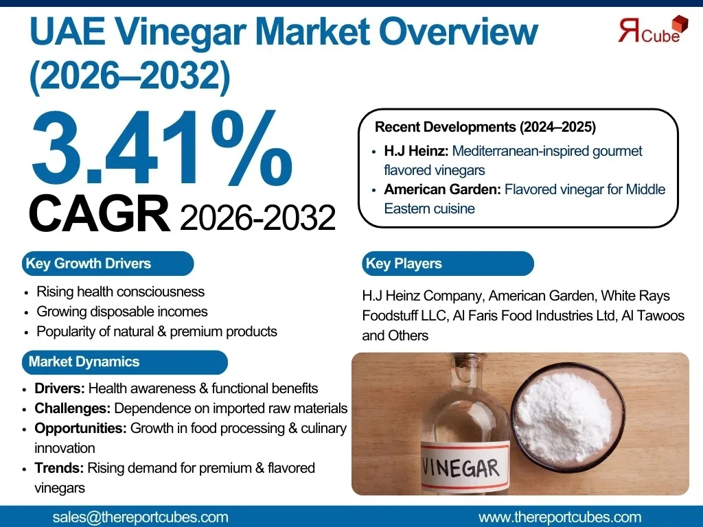According to recent study by The Report Cube future of the UAE Vinegar Market is anticipated to register a CAGR of around 3.41% during the forecast period, 2026–32. The increasing health awareness, growing disposable incomes, and the expanding popularity of natural-based products in food, beverages, and wellness applications are driving industry growth.