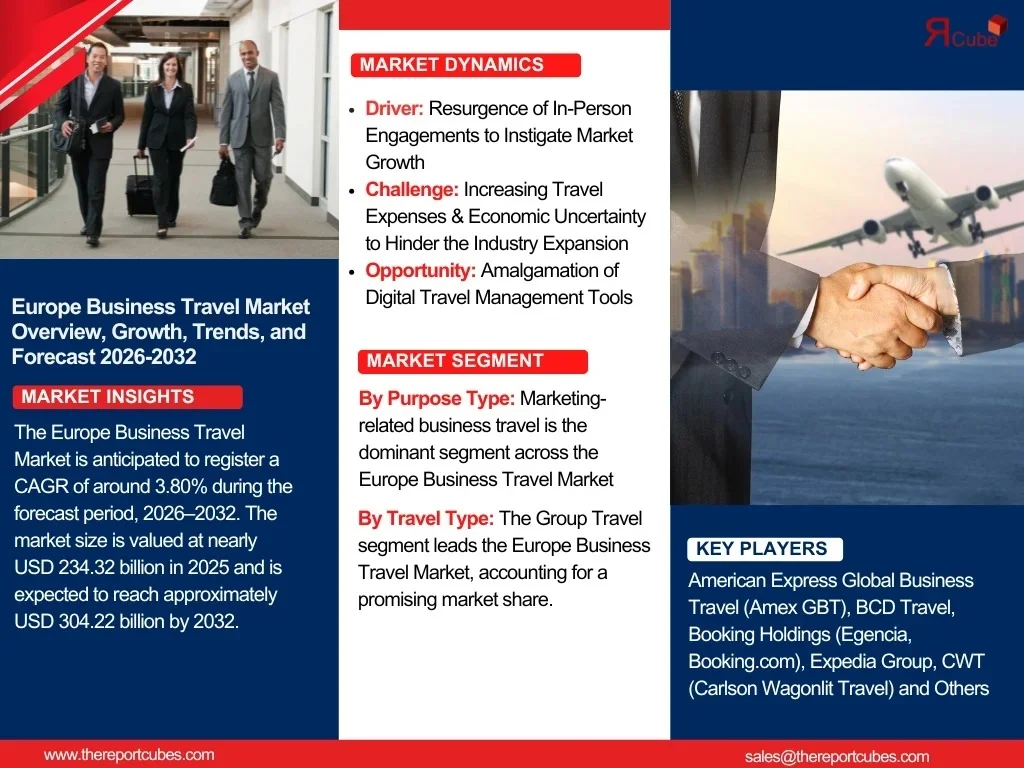 According to recent study by The Report Cube future of the Europe Business Travel Market is anticipated to register a CAGR of around 3.80% during the forecast period, 2026–2032. The market size is valued at nearly USD 234.32 billion in 2025 and is expected to reach approximately USD 304.22 billion by 2032