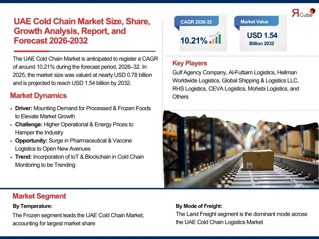 According to recent study by The Report Cube future of the UAE Cold Chain market is anticipated to register a CAGR of around 10.21% during the forecast period, 2026–32. In 2025, the market size was valued at nearly USD 0.78 billion and is projected to reach USD 1.54 billion by 2032. This is driven by increasing demand for temperature-controlled storage & transportation, specifically in the pharmaceuticals, food & beverages, and retail industries.