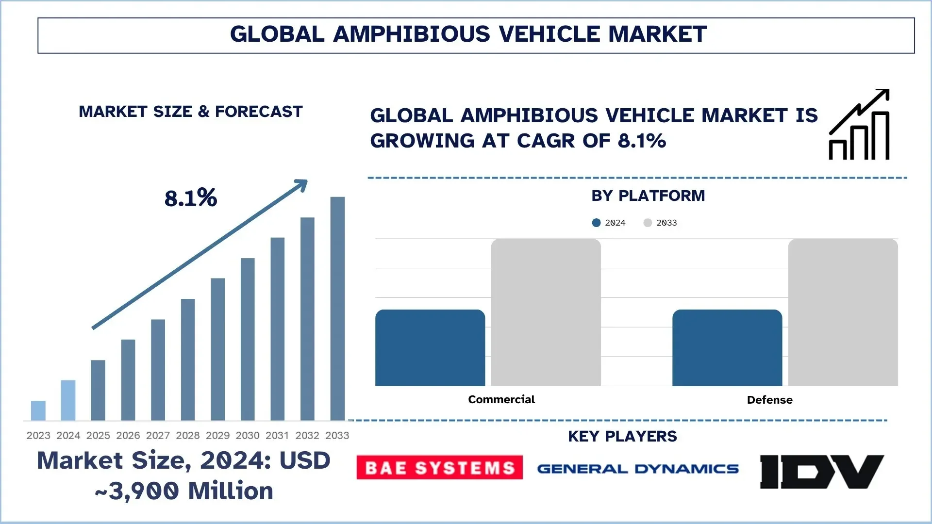 According to the UnivDatos, the rising demand for all-terrain military vehicles would fuel the demand for the Amphibious Vehicle market. As per their “Amphibious Vehicle Market” report, the global market was valued at USD 3,900 million in 2024, growing at a CAGR of about 8.1% during the forecast period from 2025 - 2033 to reach USD million by 2033.