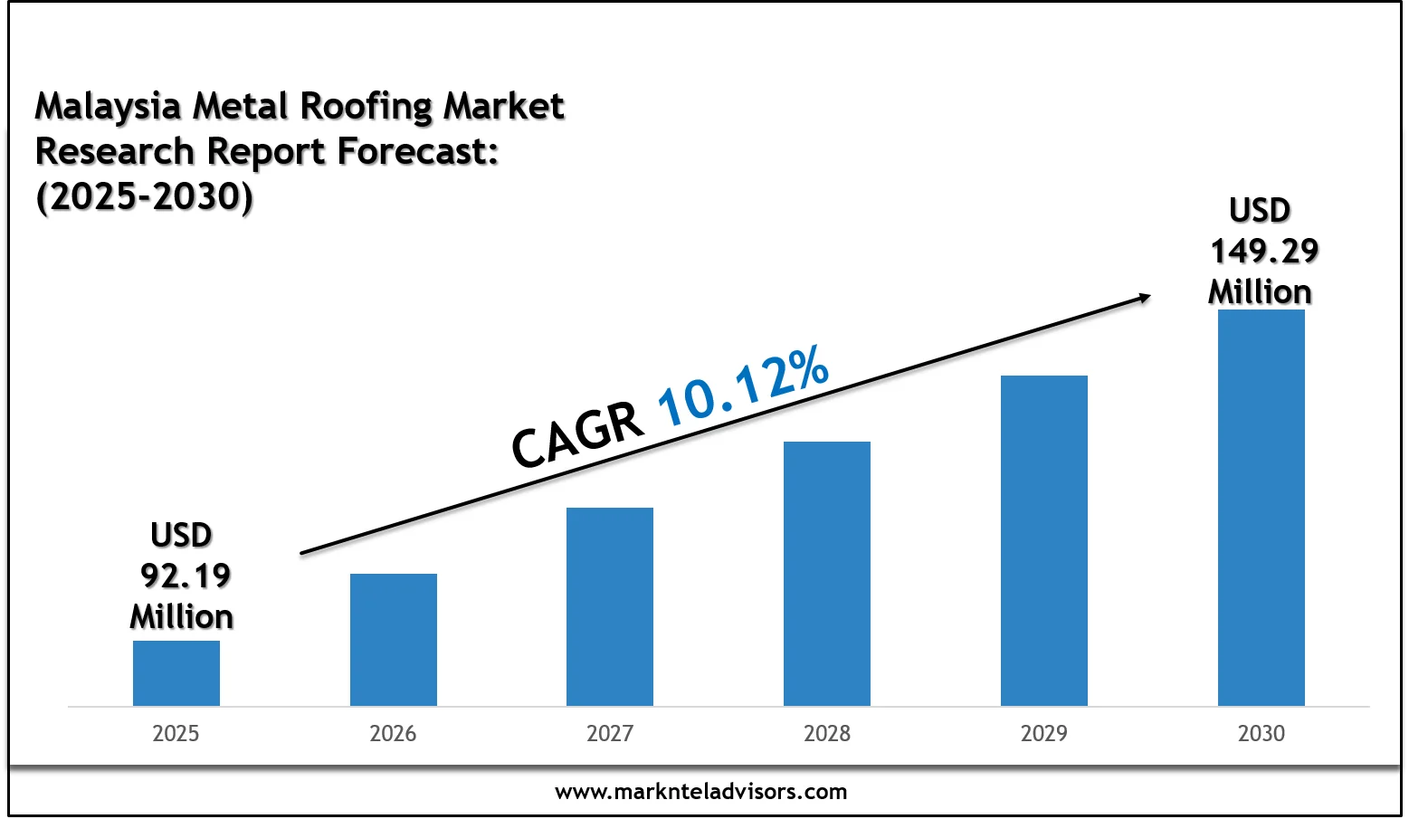 The Malaysia Metal Roofing Market size is valued at around USD 92.19 million in 2025 and is projected to reach USD 149.29 million by 2030. Along with this, the market is estimated to grow at a CAGR of around 10.12% during the forecast period, i.e., 2025-30. The Malaysia Metal Roofing Market is significantly growing due to several growth factors, including the rapid infrastructure development, the rising construction activities, the growing hospitality sector, the encouragement by the Malaysian government to build more green buildings and sustainable infrastructure, the adoption of recyclable metal roofing materials, and many more.