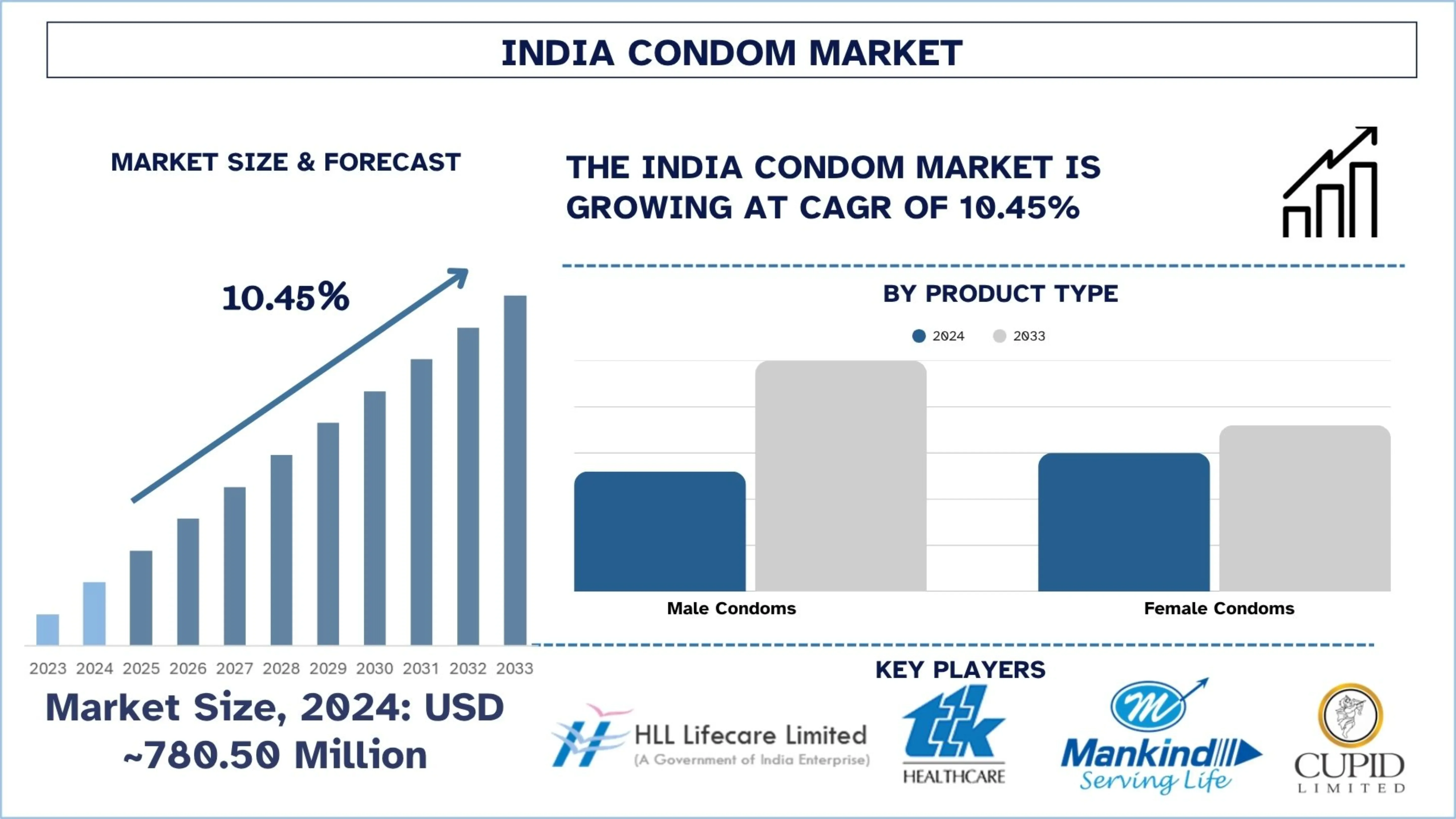 According to the UnivDatos, rising awareness of STIs and reproductive health, government-led distribution programs under NACO and NHM, increased urban youth population, and growing online retail channels promoting discreet and easy access to condoms is driving the India Condom market. As per their “India Condom Market” report, the Indian market was valued at USD ~780.5 million in 2024, growing at a CAGR of about 10.45% during the forecast period from 2025 - 2033 to reach USD million by 2033.