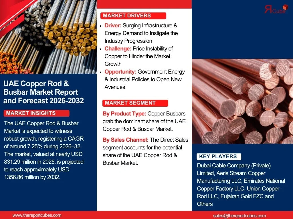 According to recent study by The Report Cube future of the UAE Copper Rod & Busbar Market is expected to witness robust growth, registering a CAGR of around 7.25% during 2026–32. The market, valued at nearly USD 831.29 million in 2025, is projected to reach approximately USD 1356.86 million by 2032.