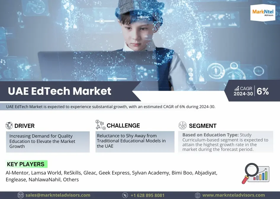 According to MarkNtel Advisors study The future of UAE EdTech Market is expected to experience substantial growth, with an estimated Compound Annual Growth Rate (CAGR) of 6% during 2024-30. The EdTech sector in the UAE is experiencing significant expansion over the coming years due to a strong trend towards incorporating technology into education, highlighting the increasing importance & investment in digital solutions to enhance learning experiences across the country.