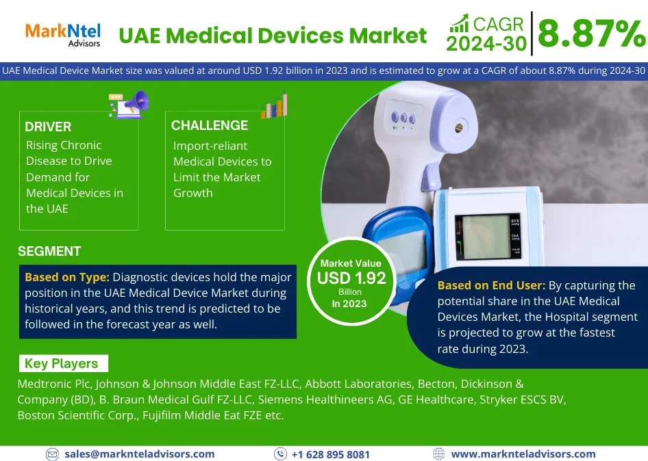 According to MarkNtel Advisors study The future of UAE Medical Devices Market size was valued at around USD 1.92 billion in 2023 and is estimated to grow at a CAGR of about 8.87% during the forecast period, i.e., 2024-30. This is largely attributed to the country's commitment to providing world-class healthcare services, strategic location as a regional healthcare hub, and a healthcare ecosystem marked by cutting-edge technology and skilled healthcare professionals.
