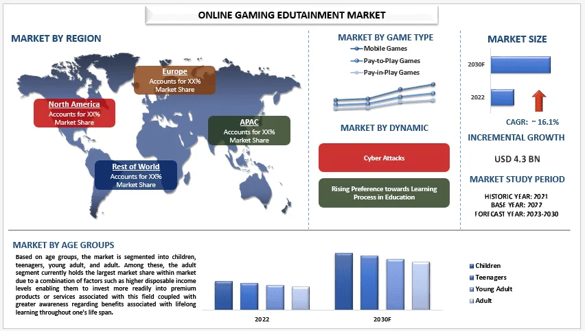 The online gaming edutainment sector will experience continued rapid growth in the coming years due to several factors such as increased demand for interactive learning experiences, advancements in technology, and shifting attitudes towards gamification as a viable educational tool. According to the UnivDatos analysis, “Online Gaming Edutainment Market” report, the global market was valued at USD 1.6 Billion in 2022, growing at a CAGR of 16.1% during the forecast period from 2023 - 2030.