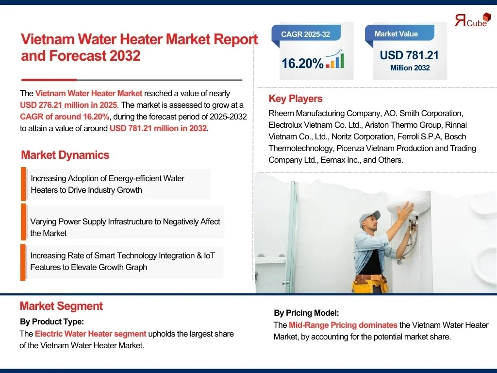 According to recent study by The Report Cube future of the Vietnam Water Heater Market Market reached a value of nearly USD 276.21 million in 2025. The market is assessed to grow at a CAGR of around 16.20%, during the forecast period of 2025-2032 to attain a value of around USD 781.21 million in 2032.