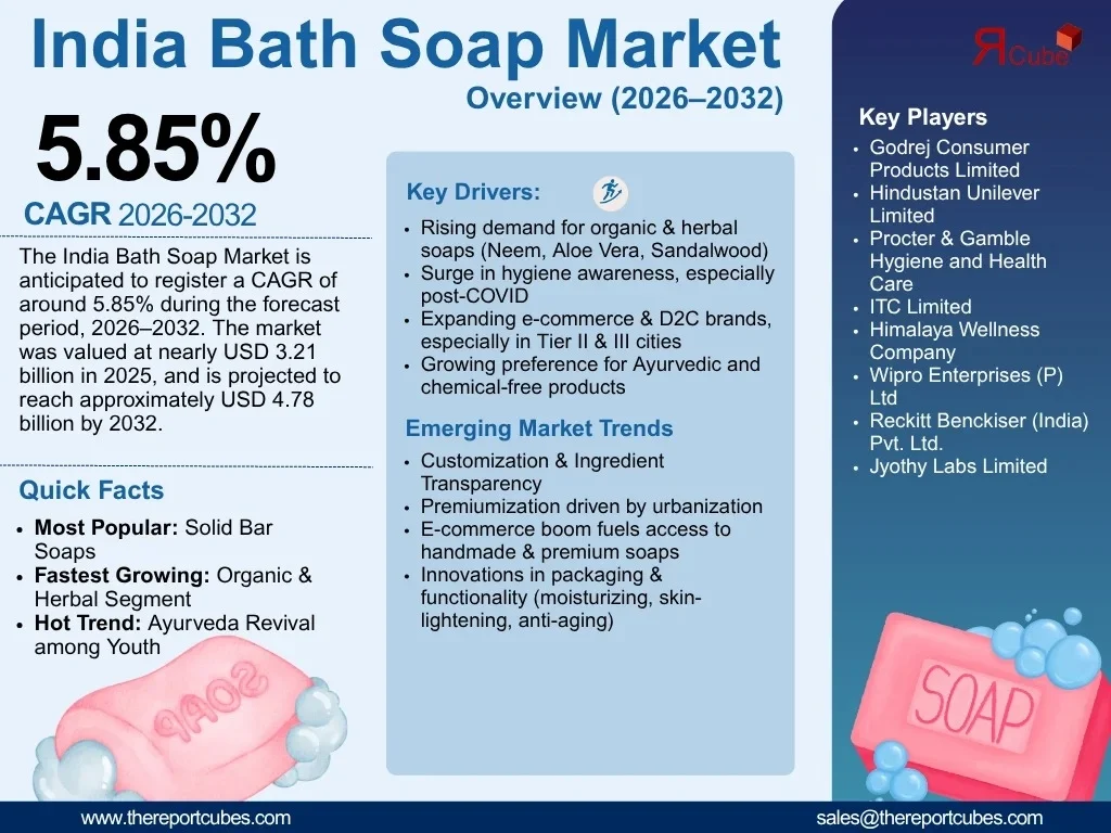 According to recent study by The Report Cube future of the India Bath Soap Market is anticipated to register a CAGR of around 5.85% during the forecast period, 2026–2032. The market was valued at nearly USD 3.21 billion in 2025, and is projected to reach approximately USD 4.78 billion by 2032