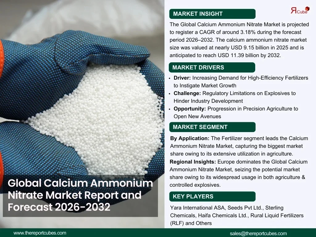 According to recent study by The Report Cube future of the Global Calcium Ammonium Nitrate Market is projected to register a CAGR of around 3.18% during the forecast period 2026–2032. The calcium ammonium nitrate market size was valued at nearly USD 9.15 billion in 2025 and is anticipated to reach USD 11.39 billion by 2032.
