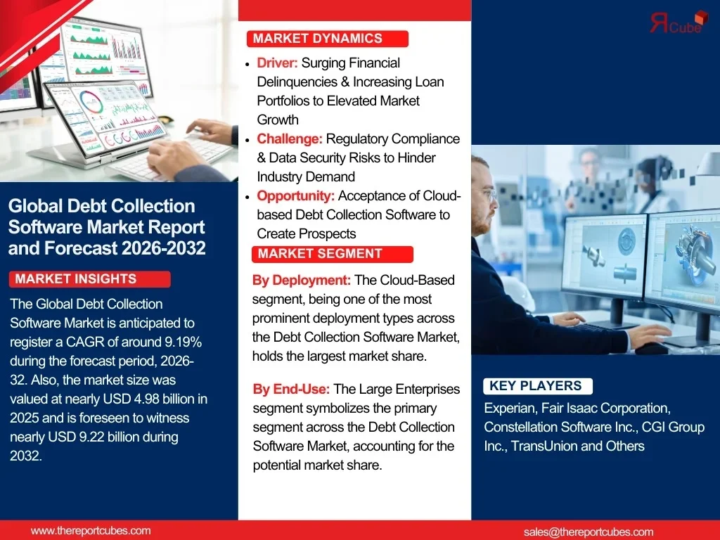 According to recent study by The Report Cube future of the Debt Collection Software Market is anticipated to register a CAGR of around 9.19% during the forecast period, 2026-32. Also, the market size was valued at nearly USD 4.98 billion in 2025 and is foreseen to witness nearly USD 9.22 billion during 2032.