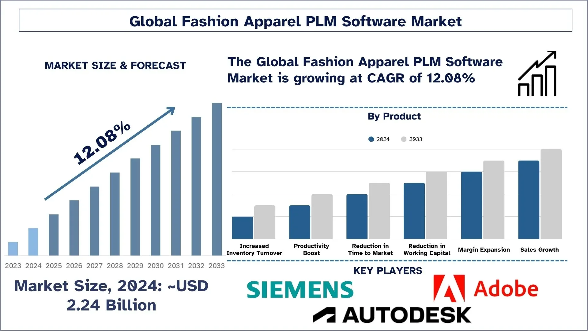 According Univdatos Analysis, The Fashion Apparel PLM Software Market was valued at approximately USD 2.24 billion in 2024 and is expected to grow at a substantial CAGR of around 12.08% during the forecast period (2025-2033), owing to the need for faster product development cycles.
