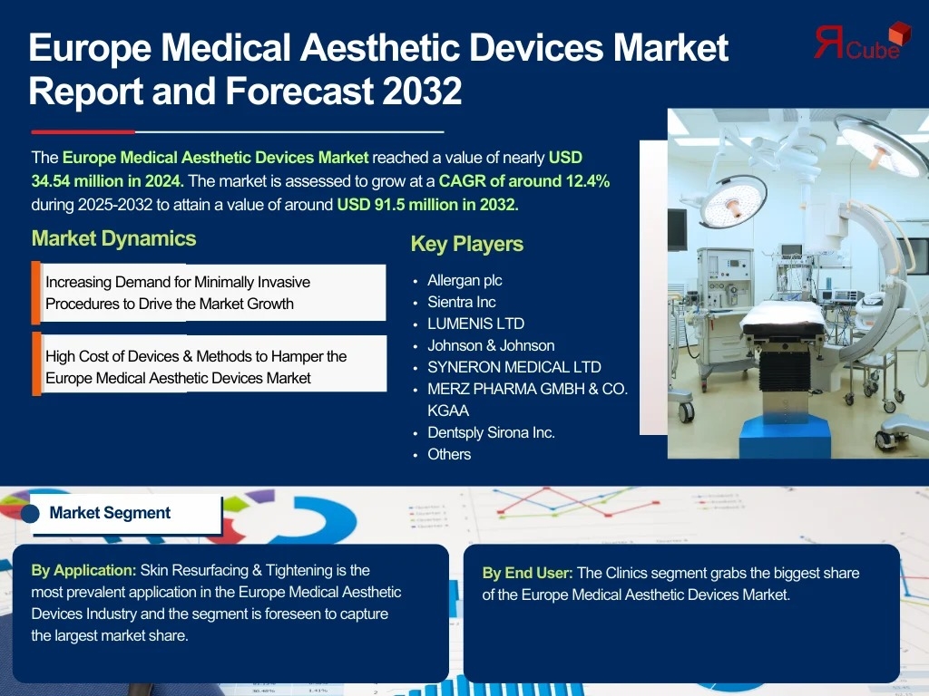 According to recent study by The Report Cube future of the Europe Medical Aesthetic Devices Market reached a value of nearly USD 34.54 million in 2024. The market is assessed to grow at a CAGR of around 12.4% during the forecast period of 2025-2032 to attain a value of around USD 91.5 million in 2032.