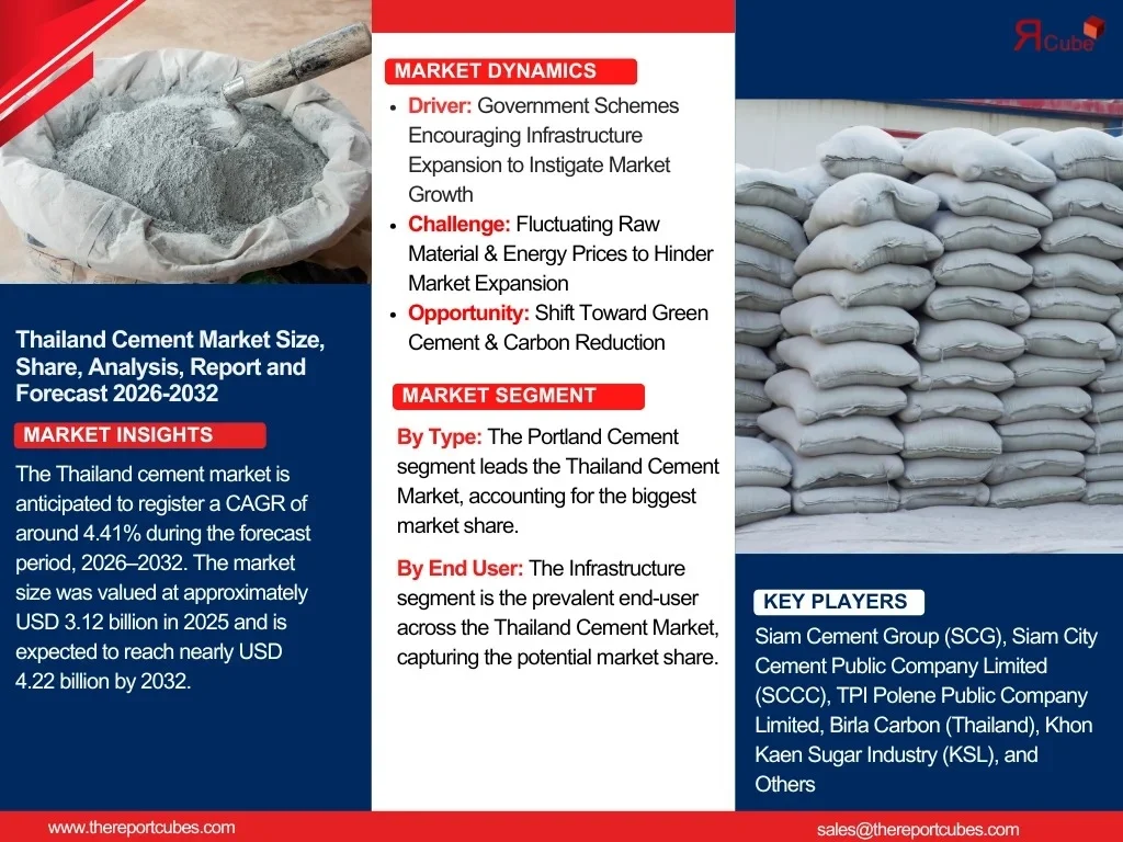 According to recent study by The Report Cube future of the Thailand Cement Market is anticipated to register a CAGR of around 4.41% during the forecast period, 2026–2032. The market size was valued at approximately USD 3.12 billion in 2025 and is expected to reach nearly USD 4.22 billion by 2032.