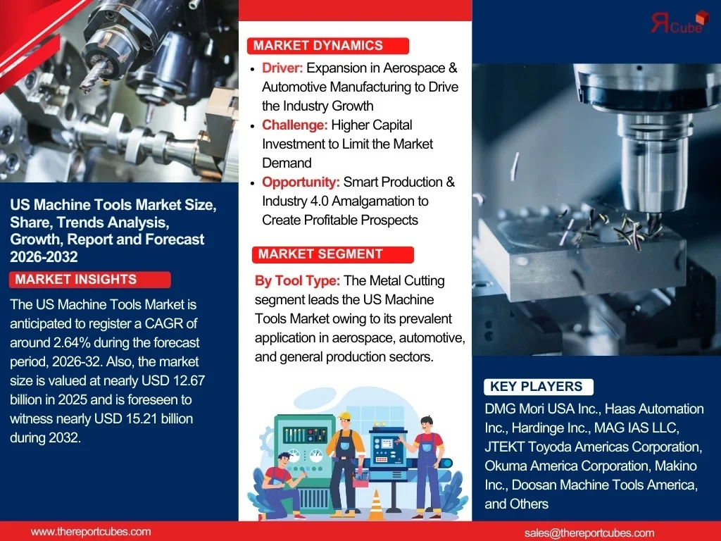 According to recent study by The Report Cube future of the US Machine Tools Market is anticipated to register a CAGR of around 2.64% during the forecast period, 2026-32. Also, the market size is valued at nearly USD 12.67 billion in 2025 and is foreseen to witness nearly USD 15.21 billion during 2032.