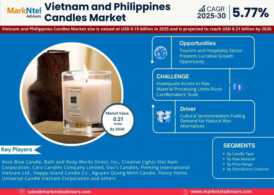 As per recent study by MarkNtel Advisors The Vietnam and Philippines Candles Market size is valued at USD 0.15 billion in 2025 and is projected to reach USD 0.21 billion by 2030. Along with this, the market is estimated to grow at a CAGR of around 5.77% during the forecast period, i.e., 2025-30.