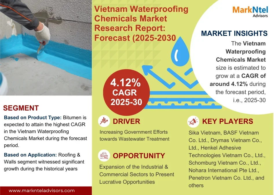 As per recent study by MarkNtel Advisors The Vietnam Waterproofing Chemicals Market size is estimated to grow at a CAGR of around 4.12% during the forecast period, i.e., 2025-30.