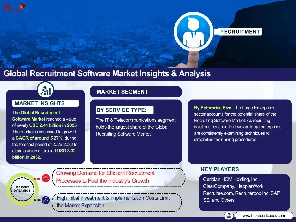 According to recent study by The Report Cube future of the Recruitment Software Market reached a value of nearly USD 2.44 billion in 2025. The market is assessed to grow at a CAGR of around 5.27%, during the forecast period of 2026-2032 to attain a value of around USD 3.32 billion in 2032.