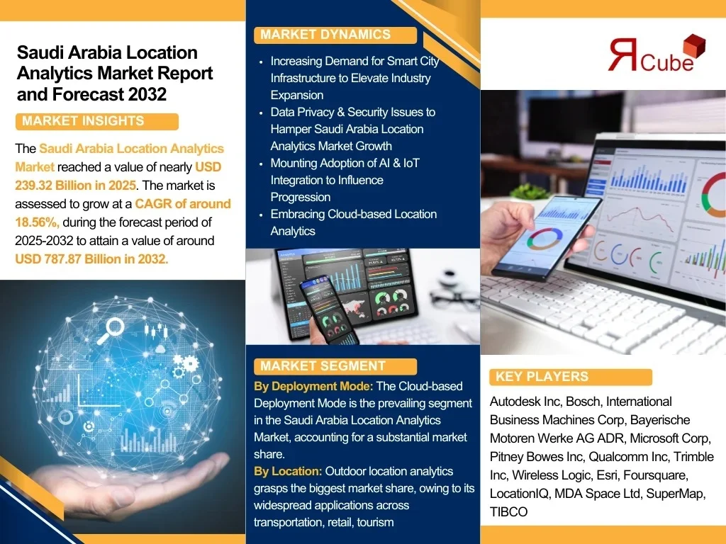 According to recent study by The Report Cube future of the Saudi Arabia Location Analytics Market reached a value of nearly USD 239.32 Billion in 2025. The market is assessed to grow at a CAGR of around 18.56%, during the forecast period of 2025-2032 to attain a value of around USD 787.87 Billion in 2032.
