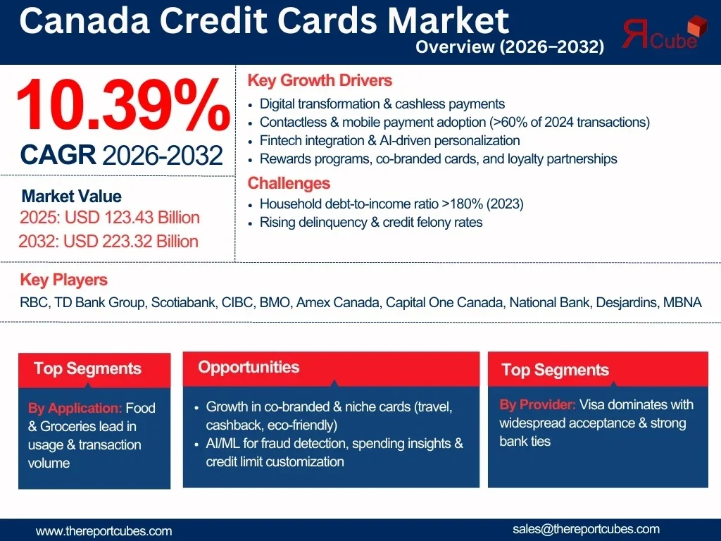 According to recent study by The Report Cube future of the Canada Credit Cards Market is anticipated to register a CAGR of around 10.39% during the forecast period, 2026-32. Also, the market size was valued at nearly USD 123.43 billion in 2025 and is foreseen to witness nearly USD 223.32 billion during 2032.