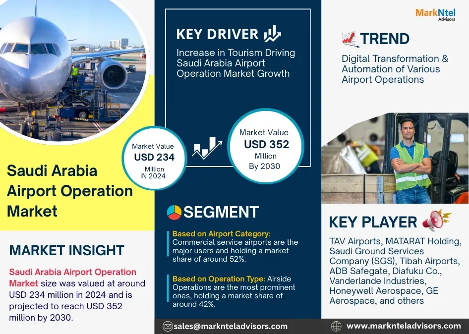 As per recent study by MarkNtel Advisors The Saudi Arabia Airport Operation Market size was valued at around USD 234 million in 2024 and is projected to reach USD 352 million by 2030. Along with this, the market is estimated to grow at a CAGR of around 7.11% during the forecast period, i.e., 2025-30.