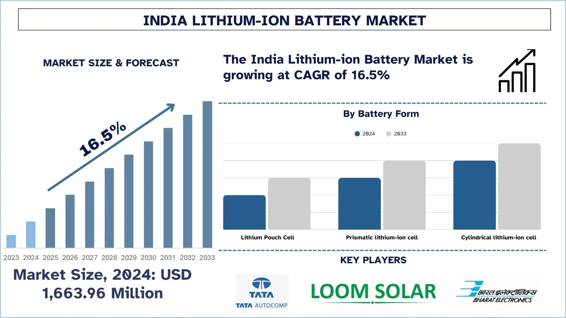 According to a new report published by UnivDatos, The Indian Lithium-ion Battery Market was valued at USD 1,663.96 million in 2024 and is expected to grow at a strong CAGR of around 16.5% during the forecast period (2025-2033). The analysis has been segmented into Battery Type (Lithium Cobalt Oxide, Lithium Iron Phosphate, Lithium Nickel Manganese Cobalt, Lithium Manganese Oxide, and Others); Battery Form (Cylindrical lithium-ion cell, Prismatic lithium-ion cell, and Lithium Pouch Cell); Power Capacity (0 to 3000mAh, 3000 to 10000mAh, 10000 to 50000mAh, and more than 50000mAh); Application (Consumer Electronics, Electric Vehicles, Energy Storage, Others); and Region/Country.
