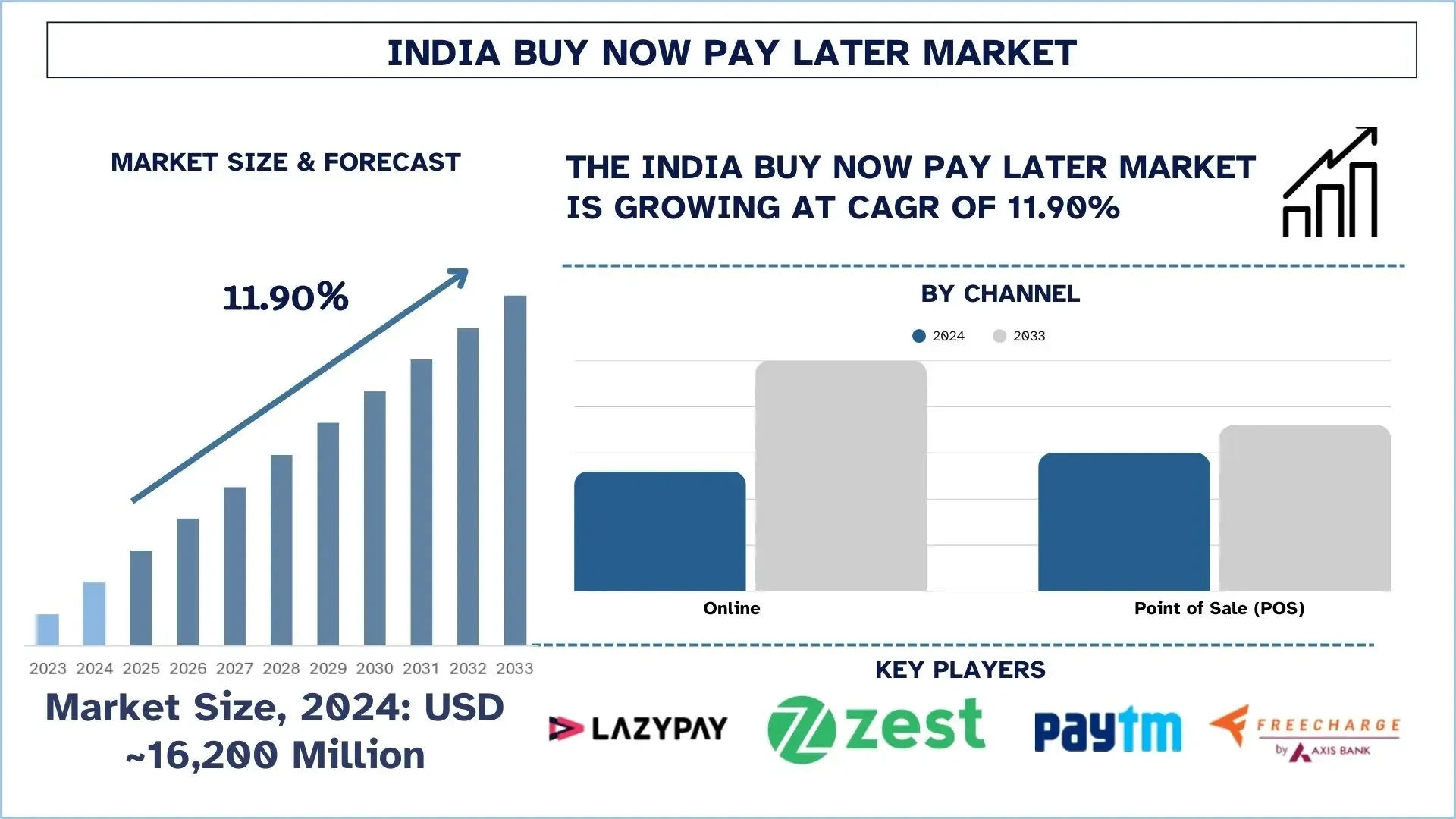 According to the UnivDatos, are rising e-commerce penetration, increasing digital payment adoption via UPI & wallets, millennial and Gen Z preference for instant credit, lack of access to traditional credit instruments (e.g., credit cards), rapid smartphone and internet penetration in Tier II & III cities, growing demand for contactless and flexible payment options drive the India Buy Now Pay Later market. As per their “India Buy Now Pay Later Market” report, the Indian market was valued at USD ~16,200 million in 2024, growing at a CAGR of about 11.90% during the forecast period from 2025 - 2033 to reach USD million by 2033.