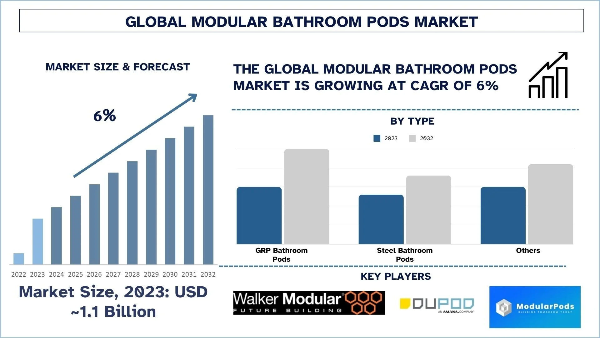 According to the UnivDatos, increasing urbanization and residential housing needs, growing adoption in hospitality and healthcare sectors, rising demand for prefabricated solutions in construction, and focus on high-quality and consistent manufacturing standards drive the modular bathroom pods market. As per their “Modular Bathroom Pods Market” report, the global market was valued at USD 1.1 Billion in 2023, growing at a CAGR of about 6% during the forecast period from 2024 - 2032 to reach USD Billion by 2032.