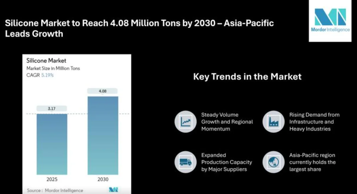 Silicone products-particularly in construction and industrial settings-are in growing demand due to their applications in sealants and coatings. Large-scale infrastructure investments, such as expanded rail networks and building projects in emerging economies, are boosting consumption.