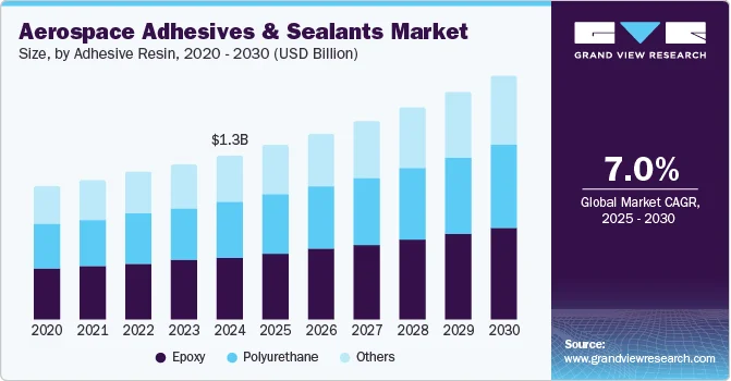 The global aerospace adhesives and sealants market size was estimated at USD 1,319.6 million in 2024 and is projected to reach USD 1,966.0 million by 2030, growing at a CAGR of 7.0% from 2025 to 2030. The aerospace adhesives and sealants market is primarily driven by a rising demand for lightweight and fuel-efficient aircraft.