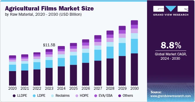 The global agricultural films market size was valued at USD 11.45 billion in 2023 and is projected to reach USD 20.59 billion by 2030, growing at a CAGR of 8.8% from 2024 to 2030. Agricultural output, demand for modern agricultural practices, and sustainable farming drive the agricultural films market during the forecast period. Agricultural film products are employed to safeguard crops in greenhouses and help plants endure extreme climates.