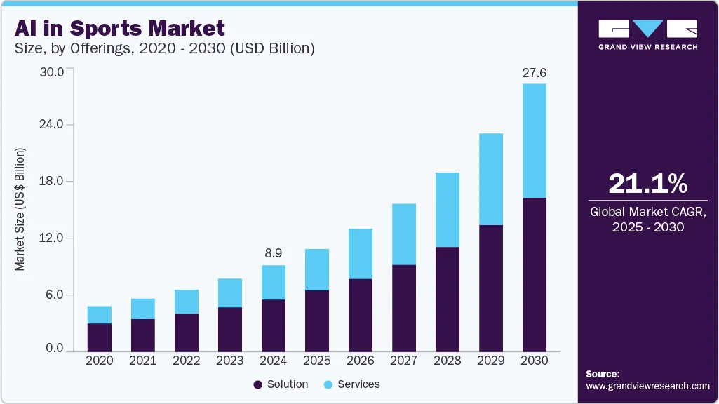 The global AI in sports market size was estimated at USD 8.92 billion in 2024 and is projected to reach USD 27.63 billion by 2030, growing at a CAGR of 21.1% from 2025 to 2030. The market growth is driven by the increasing use of AI-driven technologies by sports organizations to enhance performance, streamline training, and elevate fan engagement.
